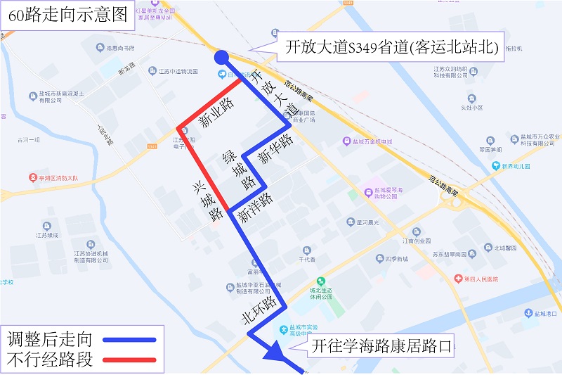 調(diào)整后走向:開(kāi)放大道S349省道(客運(yùn)北站北)、開(kāi)放大道、新華路、綠城路、新洋路、興城路、北環(huán)路、開(kāi)往學(xué)海路康居路口。